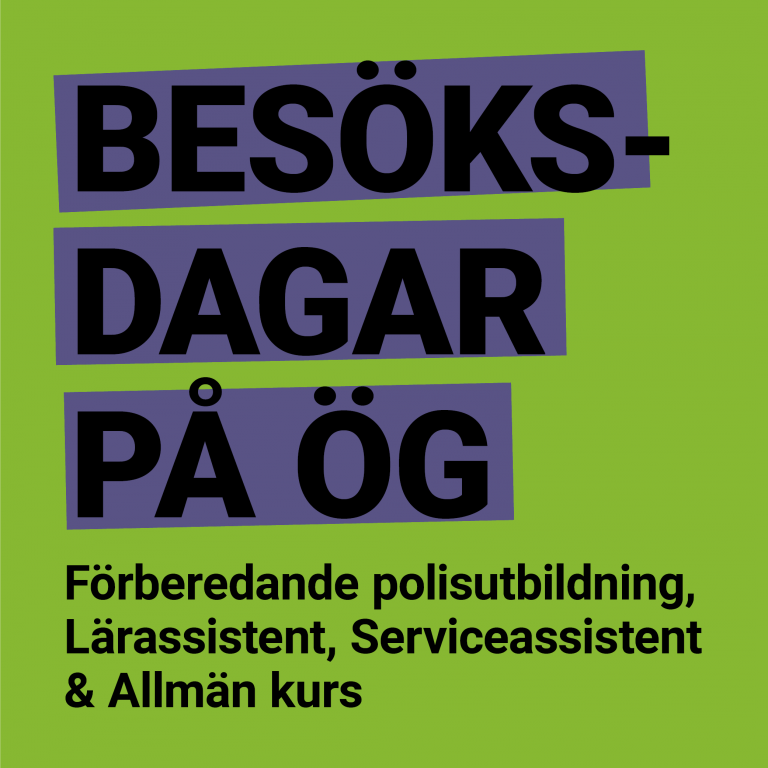 Välkommen på besöksdagar under höstterminen 2020. Under två digitala besökstillfällen samt ett fysiskt, har du möjlighet att träffa lärare från vår skola. Här kan du få svar på alla dina frågor om vår skola och våra utbildningar: Allmän kurs (gymnasienivå och högskoleförberedande), Serviceassistentutbildningen, Lärarassistentutbildningen och förberedande polisutbildningen.