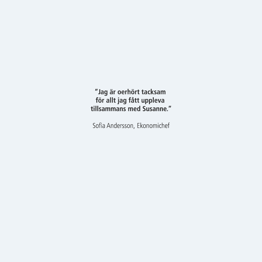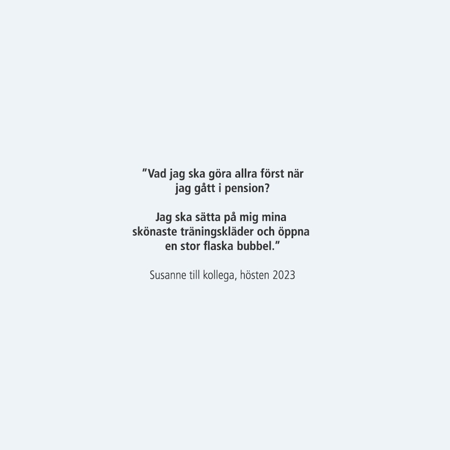 Vad framtiden väntar vet Susanne inte, mer än att hon vill träffa sina barn, barnbarn och sina vänner oftare, sporta lite mer och att hon planerar en resa till Frankrike.