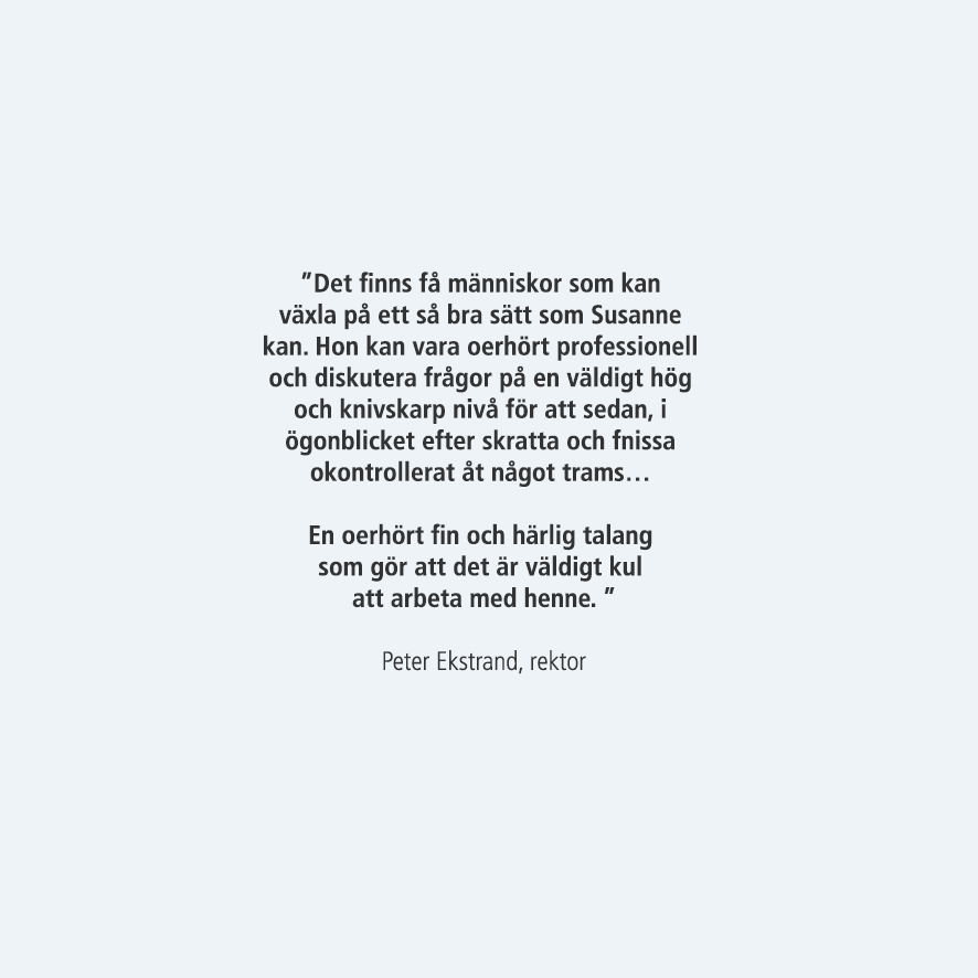 Påhlmans handelsinstitut, som är en del av Medborgarskolan, ringde och undrade om hon ville bli vd och rektor. Susannes uppdrag blev att vända institutets ekonomi. Hon älskade utbildningsvärlden och beskriver tiden på Påhlmans som jätterolig eftersom den gav henne möjlighet att få vara en del av de studerandes resa med allt vad den innebar i form av hopp och glädje men också krävande på grund av pendlingen. Varje dag i flera år pendlade hon mellan Skanör och Stockholm.